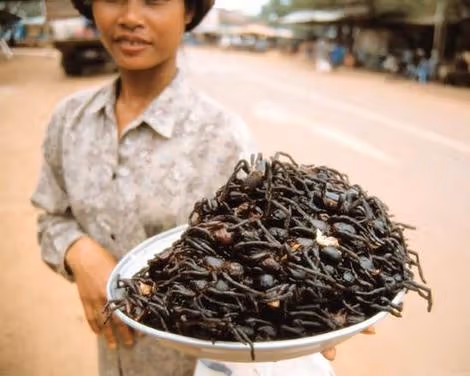 In Cambodia, Spiders are considered one of the most delicious delicacies. These Spiders are smoked dried and sold at roadside shops on the street, it was said that people developed a taste for them after they were almost starved to death during pol pot by the Khmer Rouge in 1979 and have enjoyed the delicacy since then.